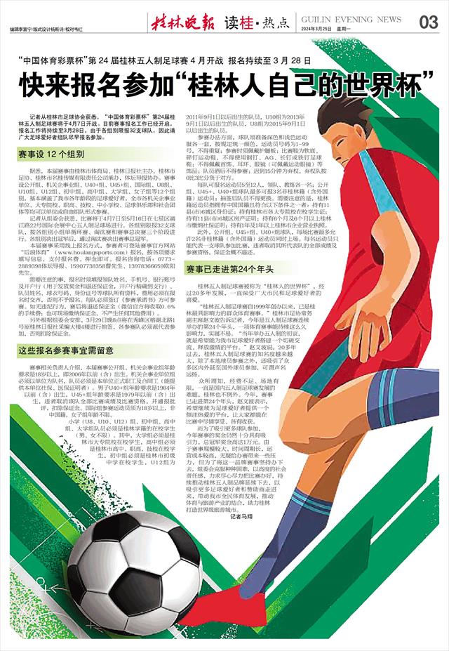 记者从桂林市足球协会获悉,“中国体育彩票杯”第24届桂林五人制足球赛将于4月7日开战。目前赛事报名工作已经开启,报名工作将持续至3月28日,由于各组别限报32支球队,因此请广大足球爱好者组队尽早报名参加。