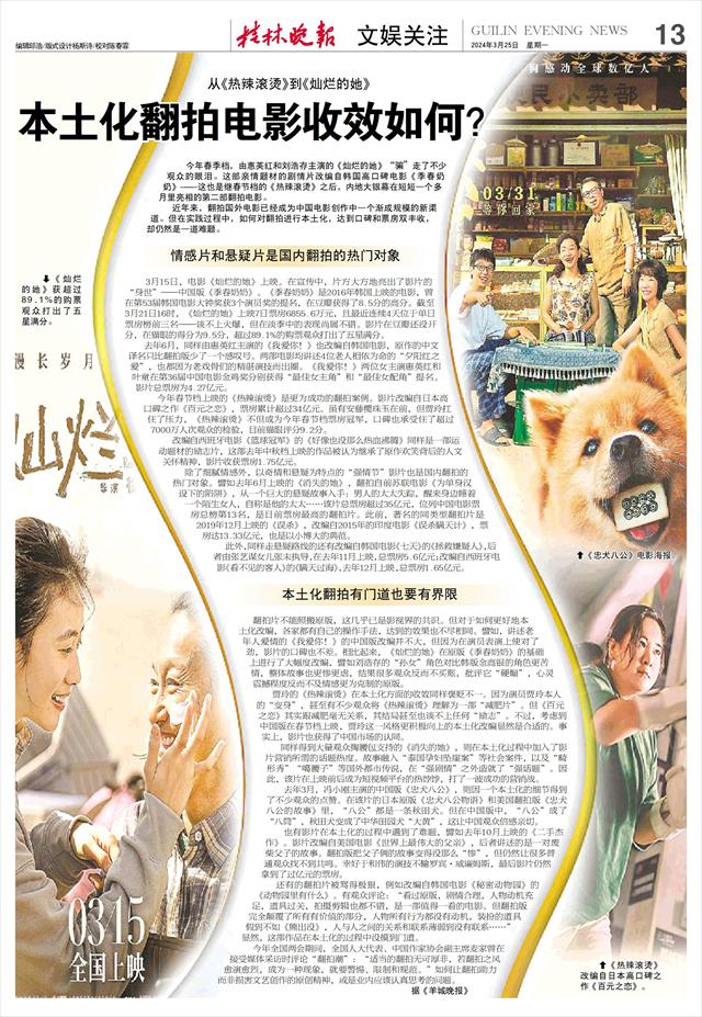从《热辣滚烫》到《灿烂的她》 本土化翻拍电影收效如何?   今年春季档,由惠英红和刘浩存主演的《灿烂的她》“骗”走了不少观众的眼泪。这部亲情题材的剧情片改编自韩国高口碑电影《季春奶奶》——这也是继春节档的《热辣滚烫》之后,内地大银幕在短短一个多月里亮相的第二部翻拍电影。