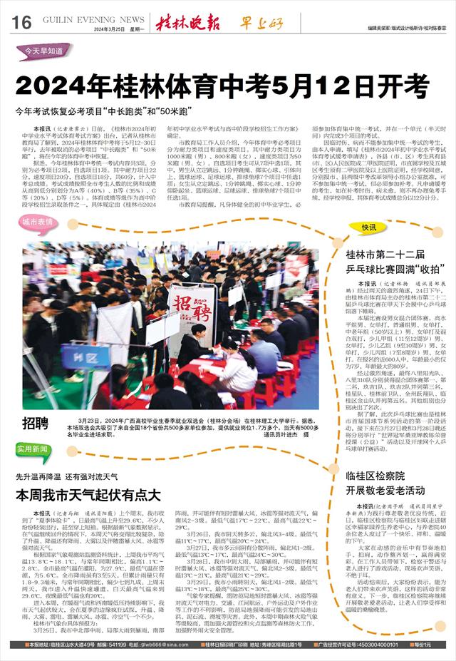 2024年桂林体育中考5月12日开考 今年考试恢复必考项目“中长跑类”和“50米跑”   本报讯(记者唐霁云)日前,《桂林市2024年初中学业水平考试体育考试方案》出台,记者从桂林市教育局了解到,2024年桂林体育中考将于5月12-30日举行,去年被取消的必考项目“中长跑类”和“50米跑”,将在今年的体育中考中恢复。