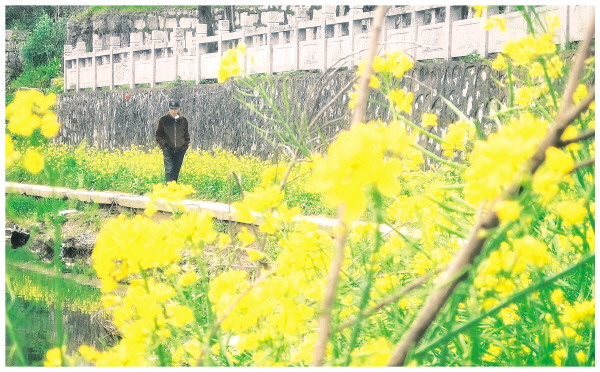 近日,小东江畔的一角油菜花盛开,一位市民沿江行走,漫步花丛中,尽情享受此处的春色。 记者滕嘉 摄