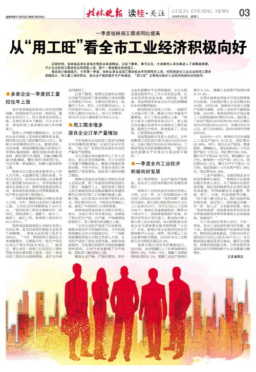 相关统计数据显示,今年第一季度,桂林众多企业招工需求较去年同期有所上涨,特别是部分工业企业的用工需求涨幅较大。用工量上涨的背后,是企业产值的提升与产线增加,“用工旺”正释放出我市工业经济持续向好的信号。