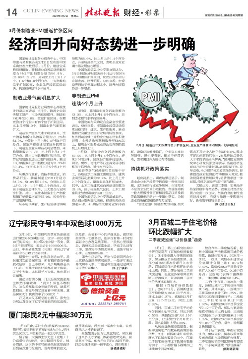 国家统计局服务业调查中心、中国物流与采购联合会3月31日发布的中国采购经理指数显示,3月份,制造业采购经理指数、非制造业商务活动指数和综合PMI产出指数分别为50.8%、53.0%和52.7%,分别比上月上升1.7个、1.6个和1.8个百分点,三大指数均位于扩张区间,企业生产经营活动加快,我国经济景气水平回升。
