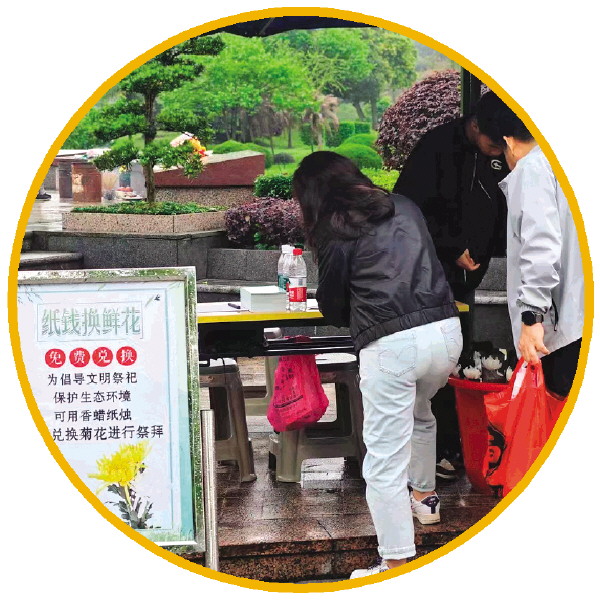 凤凰山陵园的祭扫群众自发参加“纸钱换鲜花”的活动。