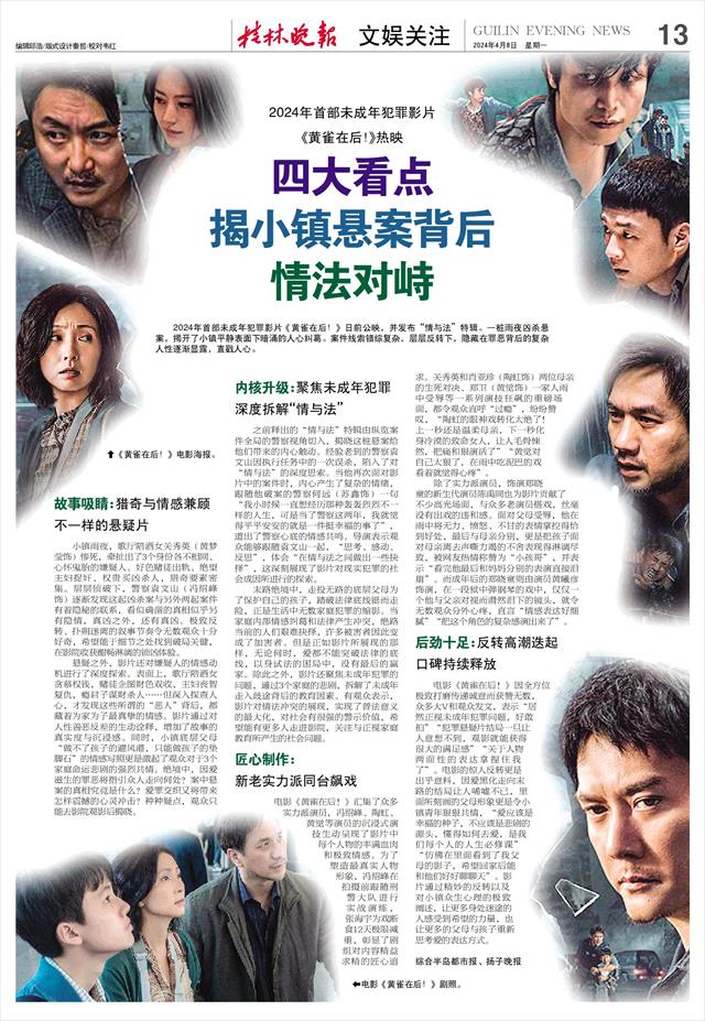 2024年首部未成年犯罪影片《黄雀在后!》日前公映,并发布“情与法”特辑。一桩雨夜凶杀悬案,揭开了小镇平静表面下暗涌的人心纠葛。案件线索错综复杂,层层反转下,隐藏在罪恶背后的复杂人性逐渐显露,直戳人心。
