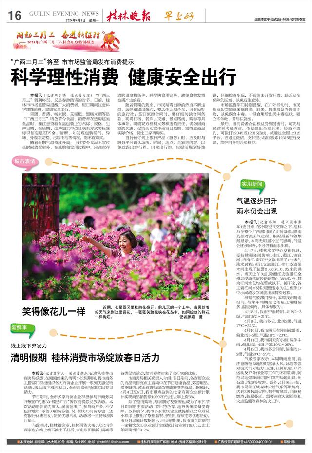 线上线下齐发力 清明假期 桂林消费市场绽放春日活力   本报讯(记者唐霁云 通讯员颜杰)记者从桂林市商务局获悉,在刚刚结束的清明小长假期间,我市商务主管部门积极组织各大商贸企业开展一系列优惠促销活动,线上线下双向发力,全市消费市场绽放出春日活力。