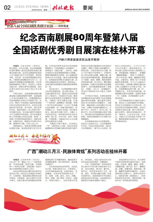 全国话剧优秀剧目展演在桂林开幕 卢映川周家斌苗庆旺出席并致辞   本报讯(记者周绍瑜)八秩荣光,薪火相传。4月20日晚,纪念西南剧展80周年暨第八届全国话剧优秀剧目展演在桂林开幕。此次纪念展演活动是深入学习贯彻习近平文化思想的一项具体举措,旨在进一步弘扬西南剧展光荣传统,不断推出戏剧精品和文艺人才,促进新时代戏剧事业高质量发展。文化和旅游部副部长卢映川,自治区人大常委会副主任、桂林市委书记周家斌,自治区副主席苗庆旺出席开幕式并分别致辞。