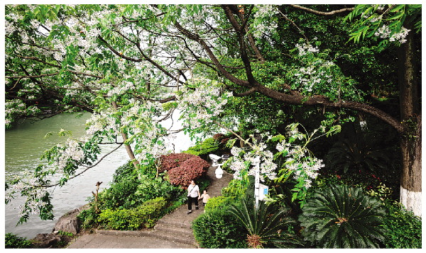 近日,宝积桥周边的几棵苦楝树开花了。高大的树枝上挂满了淡紫色的花朵,一团团一簇簇,与行人共同组成了一幅唯美浪漫的春日画卷,吸引了不少市民到这里打卡。
