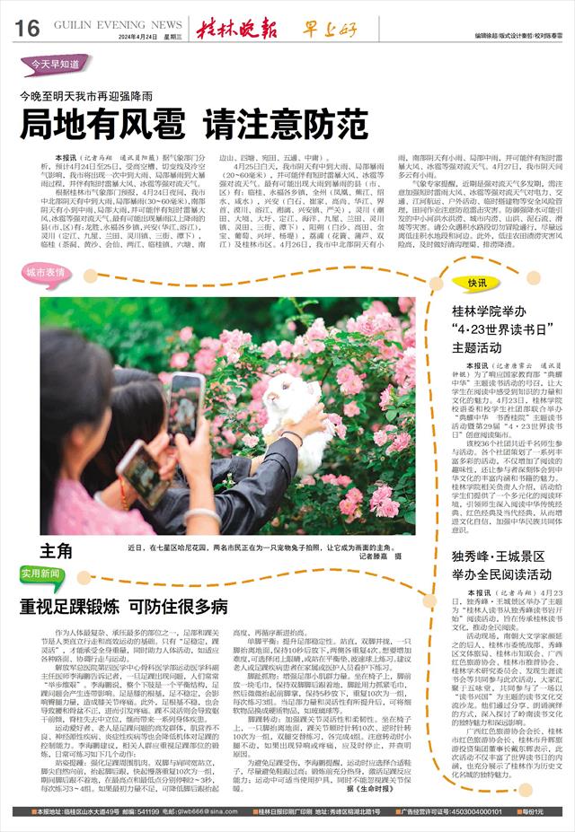 主题活动   本报讯(记者唐霁云 通讯员钟锟)为了响应国家教育部“典耀中华”主题读书活动的号召,让大学生在阅读中感受到知识的力量和文化的魅力。4月23日,桂林学院校语委和校学生社团部联合举办“典耀中华 书香桂院”主题读书活动暨第29届“4·23世界读书日”创意阅读集市。