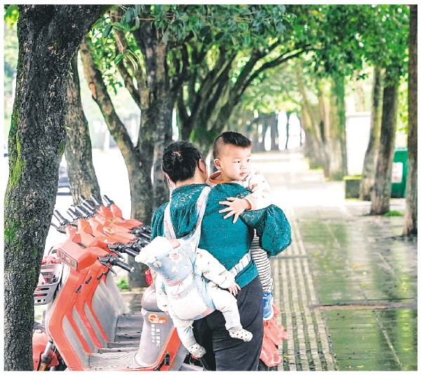 近日,在临江路上记者看到一位妈妈前面抱着一个小孩,后面背着一个,为了让孩子们健康快乐地成长,可谓是“殚竭心力终为子,可怜天下父母心”。
