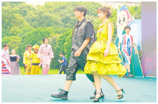图为大学生们展示利用废旧物品制作的服饰。 通讯员潘泓序 摄