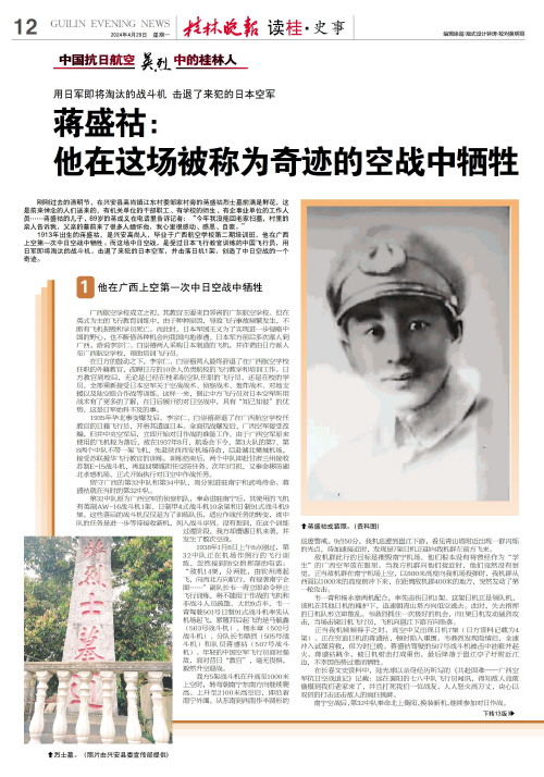 1913年出生的蒋盛祜,是兴安高尚人,毕业于广西航空学校第二期培训班,他在广西上空第一次中日空战中牺牲。而这场中日空战,是受过日本飞行教官训练的中国飞行员,用日军即将淘汰的战斗机,击退了来犯的日本空军,并击落日机1架,创造了中日空战的一个奇迹。