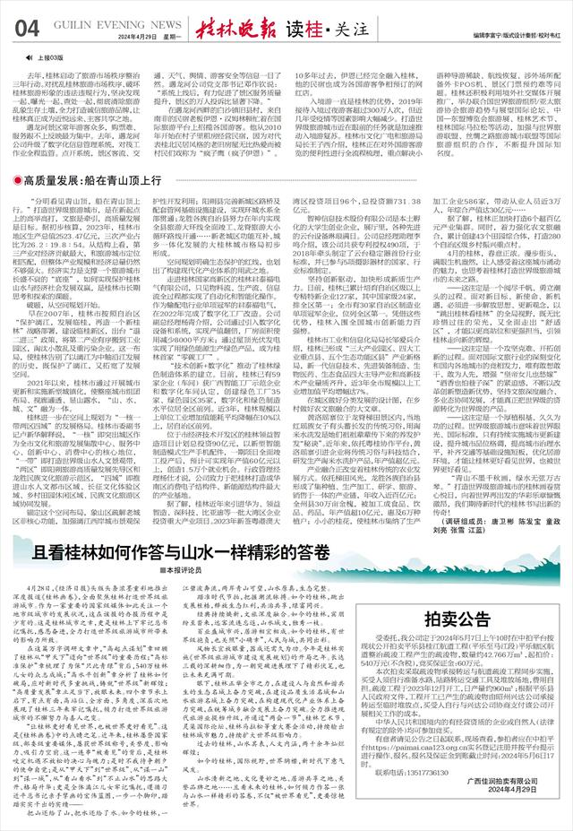 “分明看见青山顶,船在青山顶上行。”打造世界级旅游城市,是在新起点上的高举高打,文旅是牵引,高质量发展是目标。据初步核算,2023年,桂林市地区生产总值2523.47亿元,三次产业占比为26.2∶19.8∶54。从结构上看,第三产业对经济贡献最大,和旅游城市定位相匹配,但整体产业规模和经济总量仍然不够强大。经济实力是支撑一个旅游城市长盛不衰的“底座”,如何实现保护桂林山水与经济社会发展双赢,是桂林市长期思考和探索的课题。