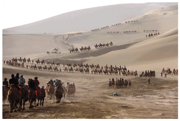5月4日,游客在甘肃省敦煌市鸣沙山月牙泉景区游览。 “五一”小长假,各地丰富文旅供给,加强服务保障,各大景区迎来客流高峰。 新华社发