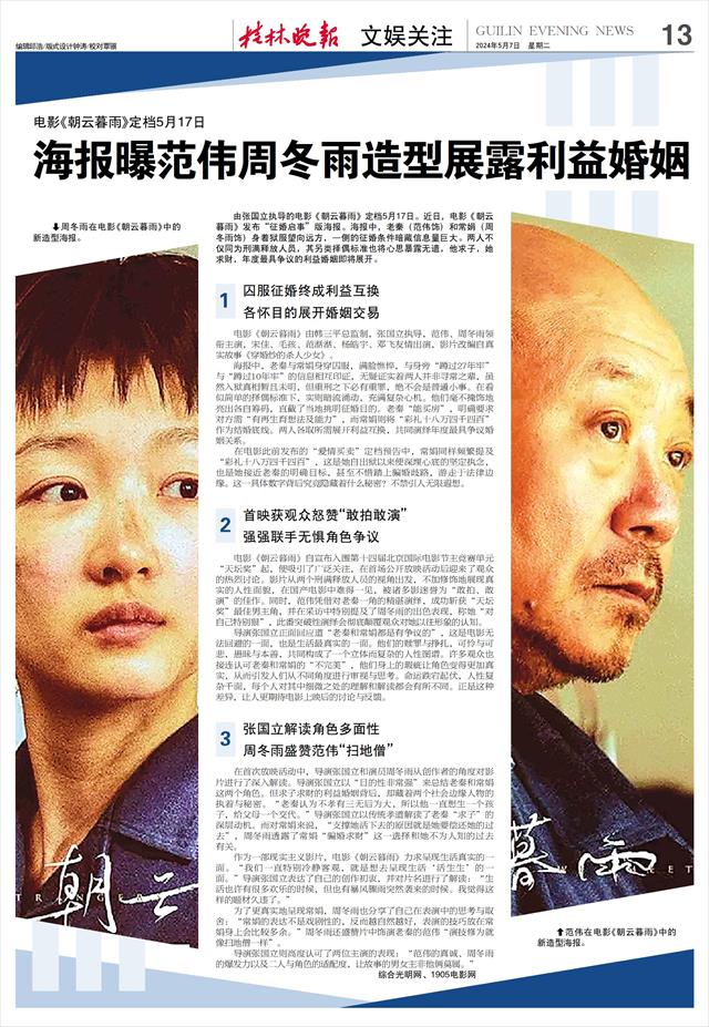 电影《朝云暮雨》定档5月17日 海报曝范伟周冬雨造型展露利益婚姻   由张国立执导的电影《朝云暮雨》定档5月17日。近日,电影《朝云暮雨》发布“征婚启事”版海报。海报中,老秦(范伟饰)和常娟(周冬雨饰)身着狱服望向远方,一侧的征婚条件暗藏信息量巨大。两人不仅同为刑满释放人员,其另类择偶标准也将心思暴露无遗,他求子,她求财,年度最具争议的利益婚姻即将展开。