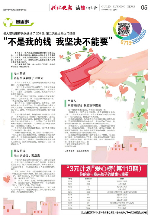 老人取钱银行失误多给了200元 第二天他主动上门归还 “不是我的钱 我坚决不能要”   5月7日,在广西灵川农商行定江支行的营业厅内,一位穿着朴素的老人将手中的200元人民币递给了工作人员,工作人员接过现金,连连向这位老人道谢。原来在头一天,该银行工作人员在这位老人取钱时多给了他200元。
