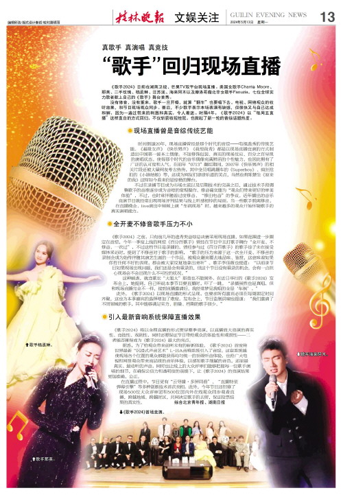 没有修音,没有重来,歌手一旦开嗓,就算“翻车”也要唱下去。电视、网络观众的收听效果,和节目现场观众同步。赛后,不少歌手表示本场表演有缺憾,但很快又与自己达成和解,因为一遍过带来的刺激和真实,令人着迷。时隔4年,《歌手2024》以“每周五直播”这样直白的方式回归,不仅斩获收视桂冠,也掀起了新一轮的音综话题热度。