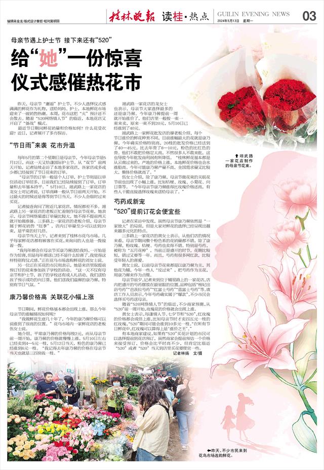 仪式感催热花市   昨天,母亲节“邂逅”护士节,不少人选择仪式感满满的鲜花作为礼物,送给妈妈、护士,本地鲜花市场迎来了一波销售热潮。本周,花市这把“火”预计还不会散去。随着“520网络情人节”的临近,本地花店又开启了“备战”模式。