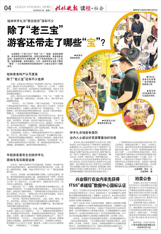 游客还带走了哪些“宝”?   从清明到“广西三月三”再到“五一”假期,连续的假期里,来桂林的游客络绎不绝。欣赏过桂林的美景,很多游客会选购一些桂林伴手礼馈赠亲朋。除了传统的桂林三宝(三花酒、桂林辣椒酱、桂林豆腐乳)之外,桂林伴手礼诞生了哪些“新宝”?它们受游客的欢迎程度如何?记者近日进行了调查走访。