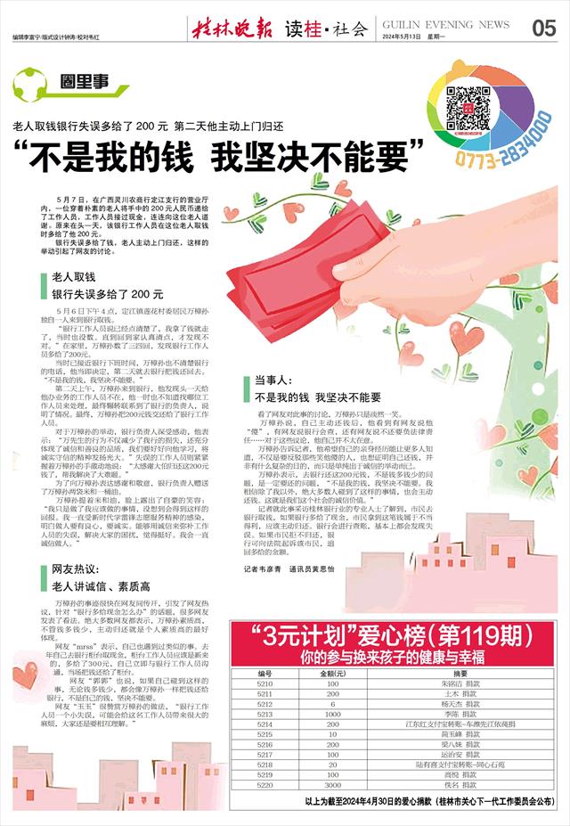 老人取钱银行失误多给了200元 第二天他主动上门归还 “不是我的钱 我坚决不能要”   5月7日,在广西灵川农商行定江支行的营业厅内,一位穿着朴素的老人将手中的200元人民币递给了工作人员,工作人员接过现金,连连向这位老人道谢。原来在头一天,该银行工作人员在这位老人取钱时多给了他200元。