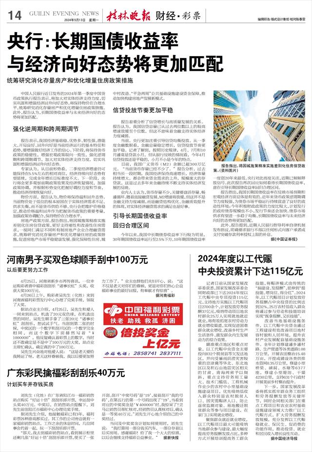 中国人民银行近日发布的2024年第一季度中国货币政策执行报告表示,将加大对实体经济支持力度,切实巩固和增强经济回升向好态势,将保持物价在合理水平,统筹研究消化存量房产和优化增量住房政策措施。此外,报告认为,长期国债收益率与未来经济向好的态势将更加匹配。