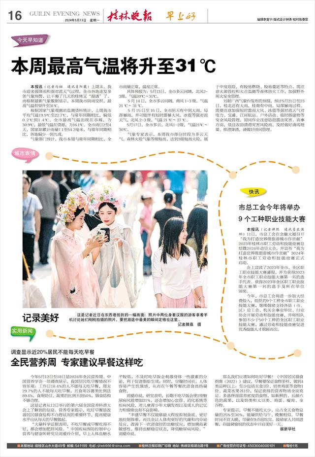 今年5月12日至18日是2024年全民营养周。中国营养学会一项调查显示,我国居民吃早餐情况不容乐观:工作日18.4%的人不能每天吃早餐,周末29.7%的人不能每天吃早餐,且食用谷薯类比例达89.4%,食用奶豆、蔬果的比例不到50%,膳食结构不够合理。