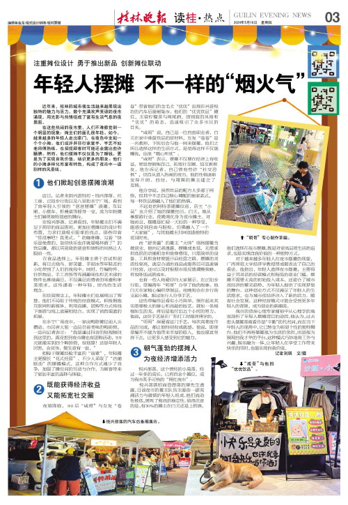 注重摊位设计 勇于推出新品 创新摊位联动 年轻人摆摊 不一样的“烟火气”   近年来,桂林的城市夜生活越来越展现出独特的魅力与活力,数个充满欢声笑语的夜市涌现,用光影与热情组成了富有生活气息的夜景图。