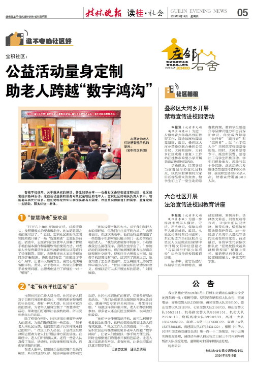 助老人跨越“数字鸿沟”   智能手机使用、关于继承权的解读、养生知识分享……在叠彩区叠彩街道宝积社区,社区经常组织各种活动。这些活动主要的服务对象就是辖区的老年人。宝积社区的相关负责人表示,辖区老年居民比较多,他们对特定的知识和服务都有所需求,社区也会根据他们的需求,量身定制一些活动,服务好这一群体。