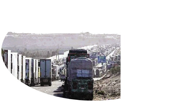 5月8日,众多运载援助物资的卡车在拉法口岸等待进入加沙。(资料图片)