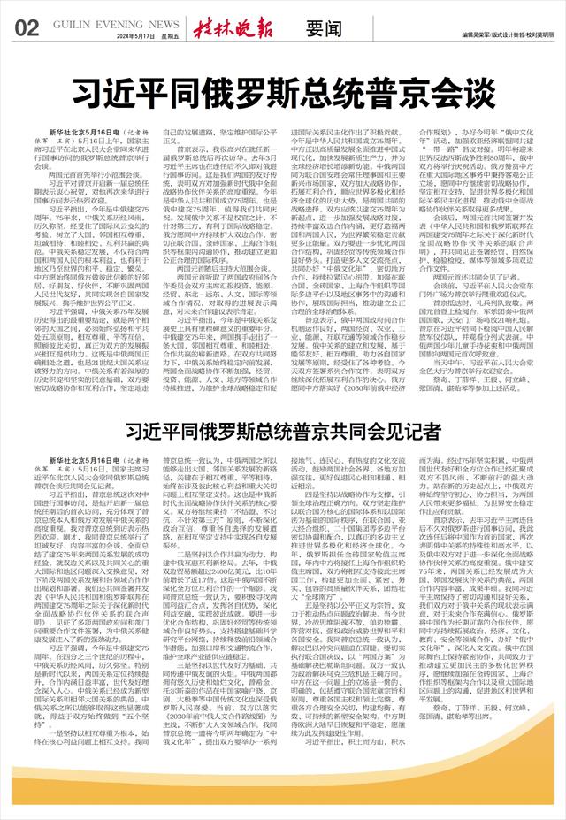 习近平指出,普京总统这次对中国进行国事访问,是他开启新一届总统任期后的首次访问,充分体现了普京总统本人和俄方对发展中俄关系的高度重视。我对普京总统到访表示热烈欢迎。刚才,我同普京总统举行了坦诚友好、内容丰富的会谈,全面总结了建交75年来两国关系发展的成功经验,就双边关系以及共同关心的重大国际和地区问题深入交换意见,对下阶段两国关系发展和各领域合作作出规划和部署。我们还共同签署并发表《中华人民共和国和俄罗斯联邦在两国建交75周年之际关于深化新时代全面战略协作伙伴关系的联合声明》,见证了多项两国政府间和部门间重要合作文件签署,为中俄关系健康发展注入了新的强劲动力。