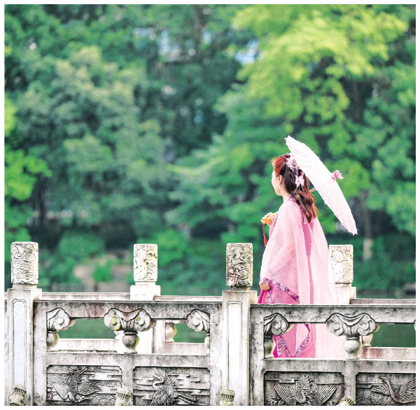 近日在榕湖九曲桥上, 一位市民穿着古风服装拍照。此情此景,给人一种“古人穿越”的感觉。记者滕嘉 摄