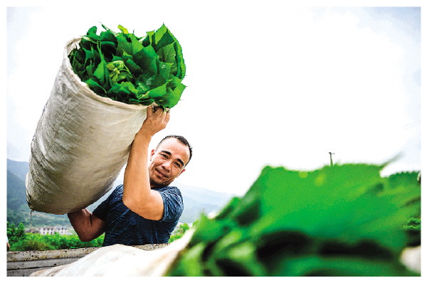 把新鲜桑叶装车拉回厂房。