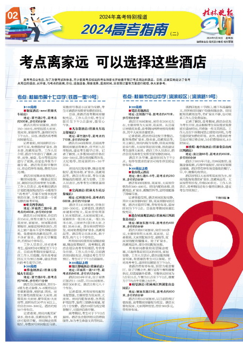 考点离家远 可以选择这些酒店   高考考点公布后,为了方便考试和休息,不少家离考点较远的考生和家长开始着手预订考点周边的酒店。日前,记者实地走访了各考点周边的酒店,从环境、与考点的距离、价位、设施设备、隔音效果、退房时间、目前预订量等方面进行梳理,供大家参考。