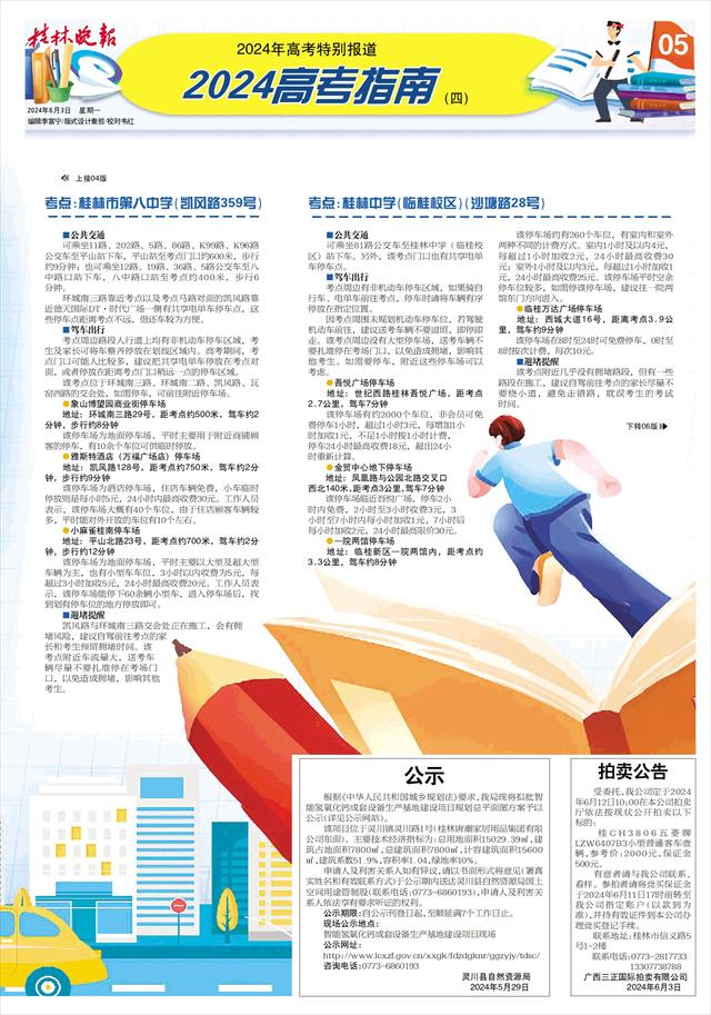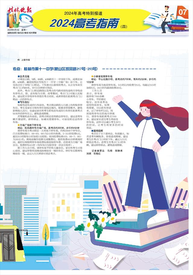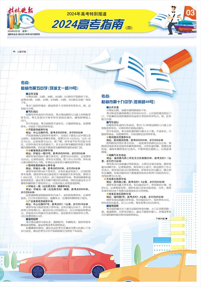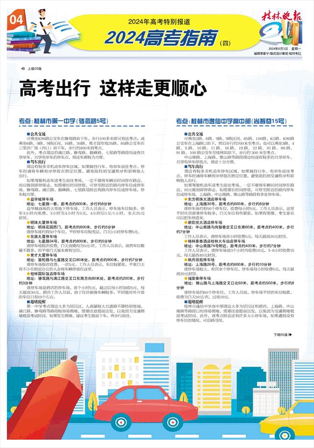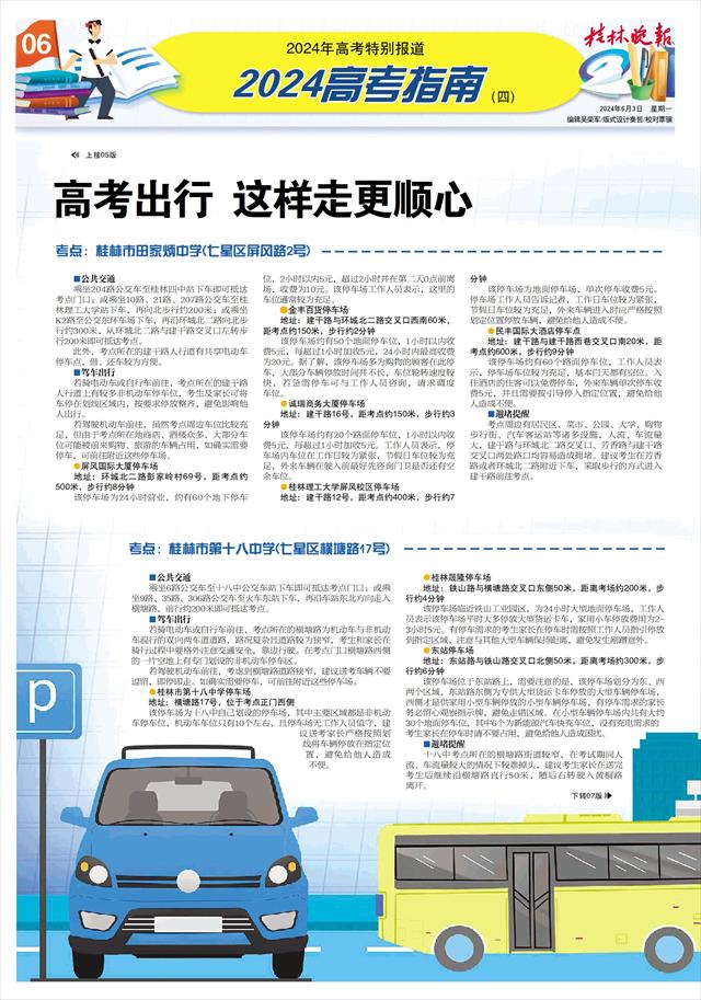 此外,今年高考期间,交警部门将在桂林市田家炳中学、桂林市中山中学(漓滨校区)、桂林市第十八中学(横塘高中部)、桂林市第十九中学等考点周边道路设置临时停车位,提供给运送考生的大巴停放。请送考大巴司机听从现场交警指挥,在指定位置有序停放。