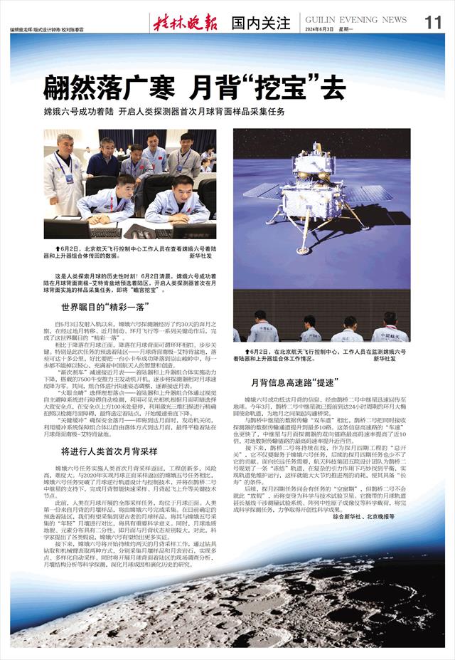 翩然落广寒 月背“挖宝”去 嫦娥六号成功着陆 开启人类探测器首次月球背面样品采集任务 ●详见 11 版