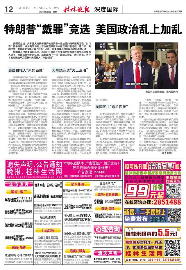 特朗普“戴罪”竞选 美国政治乱上加乱   美国前总统、共和党人特朗普日前被纽约市一家法院的陪审团裁定在“封口费”案中有罪,成为美国历史上首位在刑事案件中被定罪的前总统。连日来,美国民主、共和两党围绕此事“对轰”不断,将美国政治的撕裂与混乱暴露无遗。
