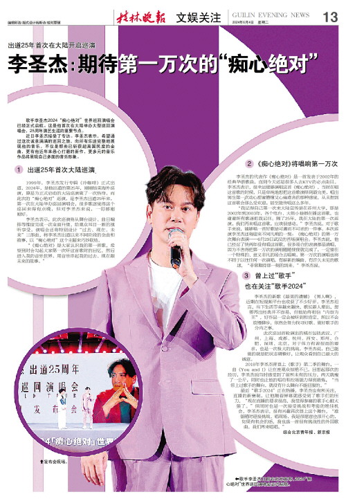出道25年首次在大陆开启巡演 李圣杰:期待第一万次的“痴心绝对”   歌手李圣杰2024“痴心绝对”世界巡回演唱会已经正式启航。这是他首次在大陆举办大型巡回演唱会,25周年演艺生涯的重要节点。