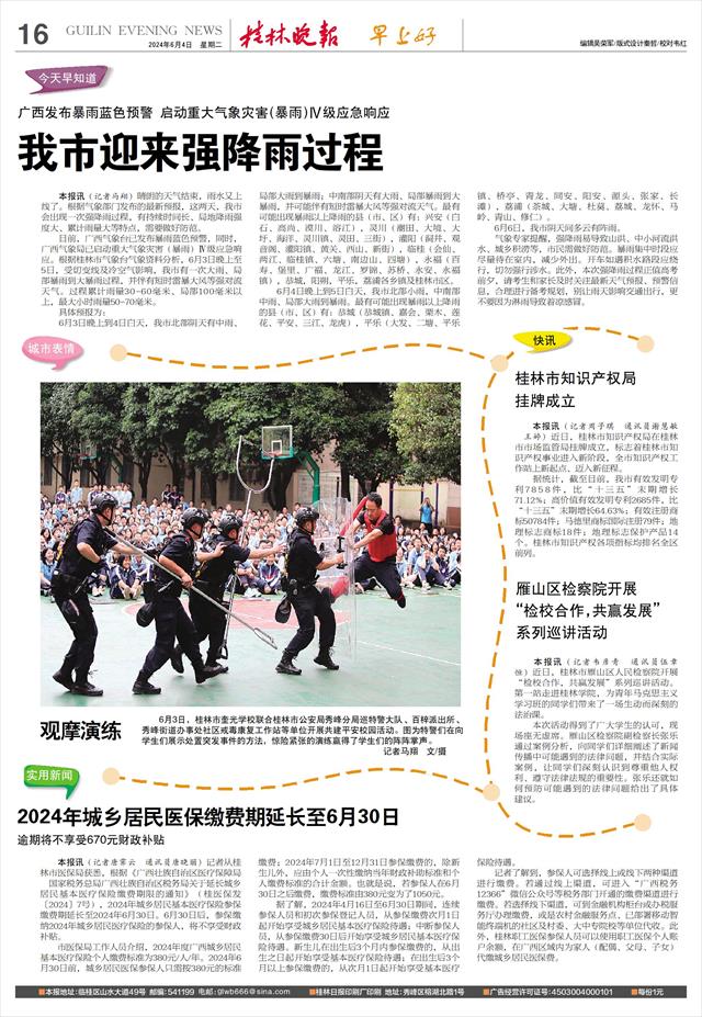 目前,广西气象台已发布暴雨蓝色预警,同时,广西气象局已启动重大气象灾害(暴雨)Ⅳ级应急响应。根据桂林市气象台气象资料分析,6月3日晚上至5日,受切变线及冷空气影响,我市有一次大雨、局部暴雨到大暴雨过程,并伴有短时雷暴大风等强对流天气。过程累计雨量30-60毫米、局部100毫米以上,最大小时雨量50-70毫米。