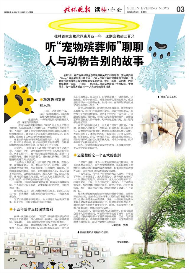 去年5月,在农业农村及生态环境等相关部门的指导下,宠物殡葬店“Living”在叠彩区尧山路开业。记者从市农业农村局兽医科了解到,这是我市首家提供正规宠物殡葬服务的店铺。营业一年来,店内唯一的宠物殡葬师“瑶瑶”(化名),为超过三百只宠物策划了告别仪式。于她而言,每一次服务都会与一个人和宠物的故事相遇。