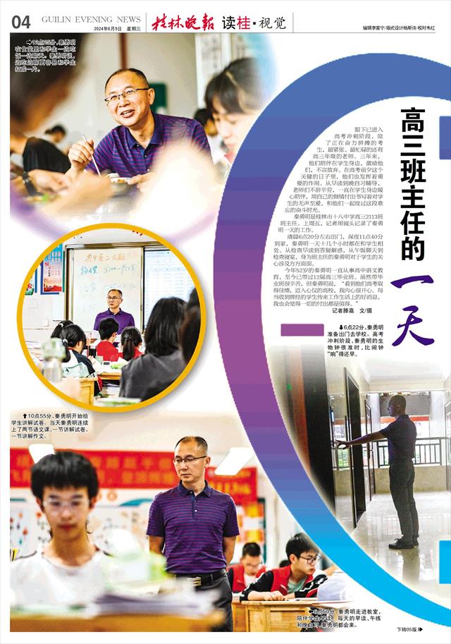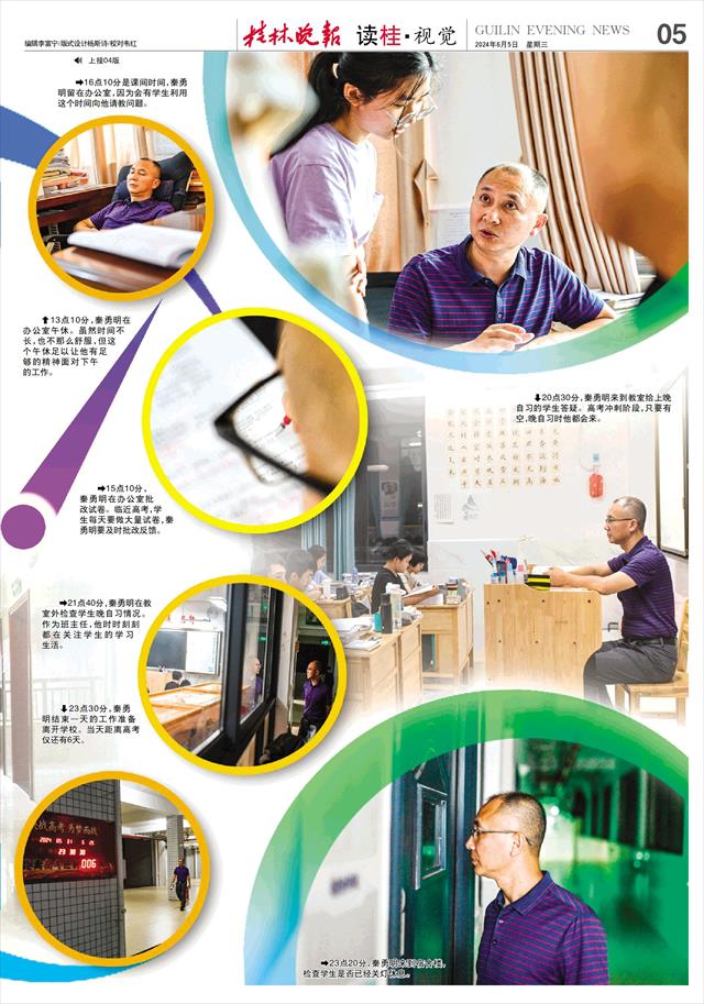 秦勇明是桂林市十八中学高三2113班班主任。上周五,记者用镜头记录了秦勇明一天的工作。