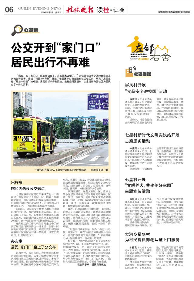“现在,在‘家门口’就能搭公交车,实在是太方便了。”家住棠棣之华小区的秦女士高兴地告诉记者,最近“微巴214号线”开进了七星区穿山街道融和社区辖区内,解决了居民出行“最后一公里”的难题。居民的诉求得到回应,出行变得更便利,大家纷纷夸赞社区为居民办了一件大实事。