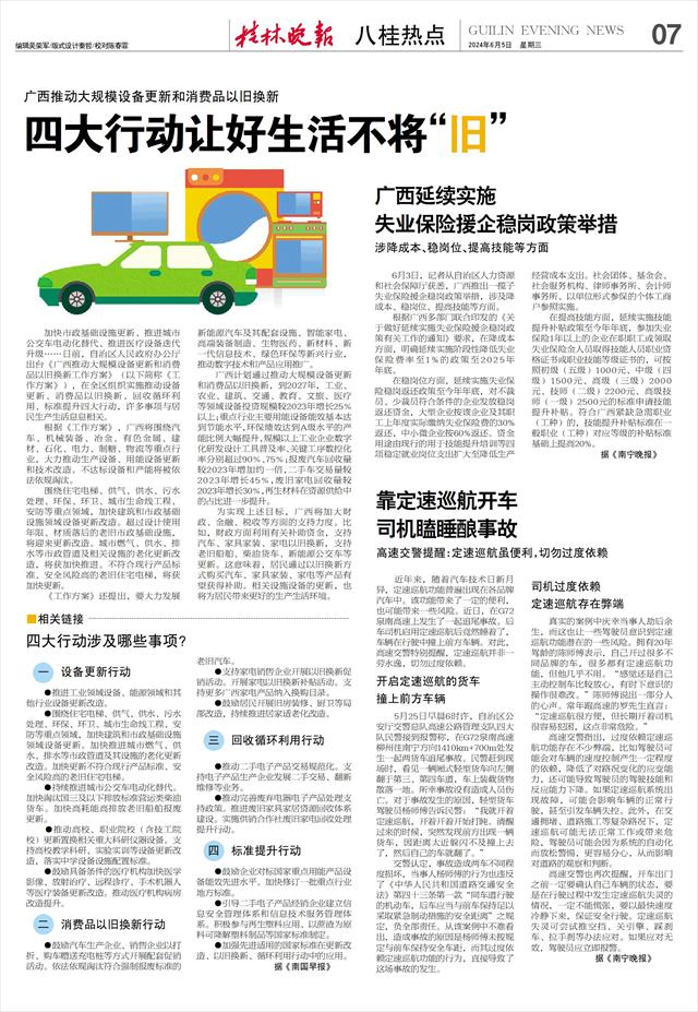 加快市政基础设施更新、推进城市公交车电动化替代、推进医疗设备迭代升级……日前,自治区人民政府办公厅出台《广西推动大规模设备更新和消费品以旧换新工作方案》(以下简称《工作方案》),在全区组织实施推动设备更新、消费品以旧换新、回收循环利用、标准提升四大行动,许多事项与居民生产生活息息相关。