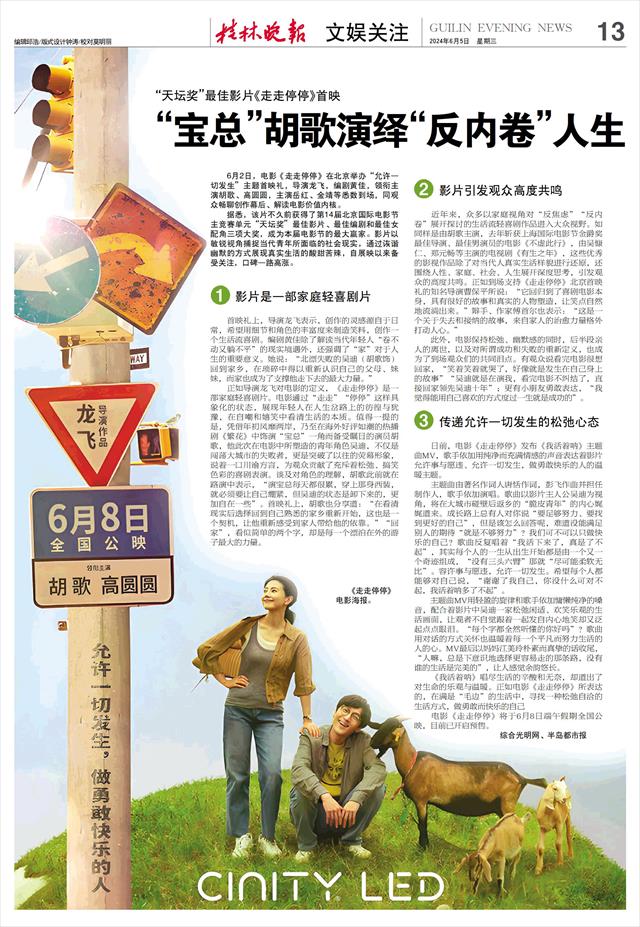 近年来,众多以家庭视角对“反焦虑”“反内卷”展开探讨的生活流轻喜剧作品进入大众视野。如同样是由胡歌主演,去年斩获上海国际电影节金爵奖最佳导演、最佳男演员的电影《不虚此行》,由吴慷仁、郑元畅等主演的电视剧《有生之年》,这些优秀的影视作品除了对当代人真实生活样貌进行还原,还围绕人性、家庭、社会、人生展开深度思考,引发观众的高度共鸣。正如到场支持《走走停停》北京首映礼的知名导演曹保平所说:“它回归到了喜剧电影本身,具有很好的故事和真实的人物塑造,让笑点自然地流淌出来。”辩手、作家傅首尔也表示:“这是一个关于失去和接纳的故事,来自家人的治愈力量格外打动人心。”