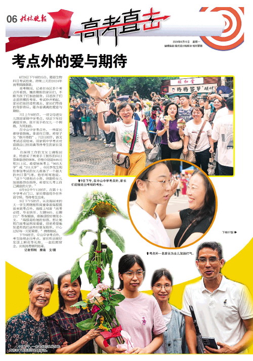 昨日,广西2024年高考落下帷幕。考试期间,记者走访市区多个考点,遇到一个又一个暖心故事,拍下一个又一个感人瞬间,无数人温情相伴高考路,为追逐梦想的莘莘学子“保驾护航”。