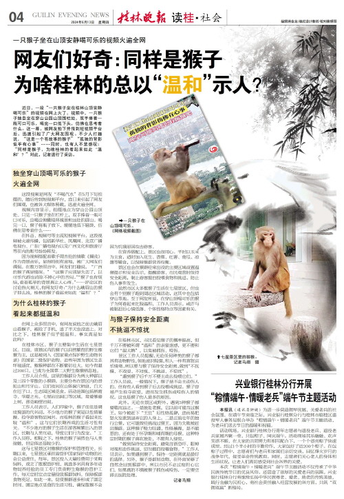 为啥桂林的总以“温和”示人?   近日,一段“一只猴子坐在桂林山顶安静喝可乐”的视频在网上火了。视频中,一只猴子独自坐在穿山公园山顶围栏处,双手捧着一瓶可口可乐,喝完一口低下头,仿佛在思考着什么。这一幕,被网友拍下并传到短视频平台后,迅速引起了广大网友围观。不少人打趣说,“这是一个有故事的猴子”“孤独的背影似乎有心事”……同时,也有人不禁感叹:“同样是猴子,为啥桂林的看起来如此‘温和’?”对此,记者进行了采访。