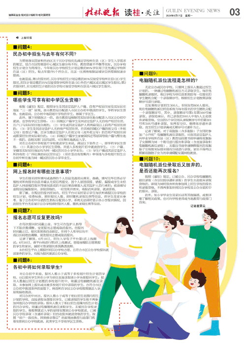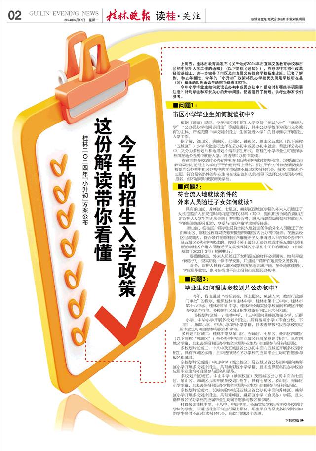上周五,桂林市教育局发布《关于做好2024年市直属义务教育学校和市区初中招生入学工作的通知》(以下简称《通知》),在总结往年招生改革经验基础上,进一步完善了市区及市直属义务教育学校招生政策。记者了解到,和去年相比,今年的“小升初”政策将民办学校优先满足学校所在县(区)招生的比例由去年的80%提高至85%。