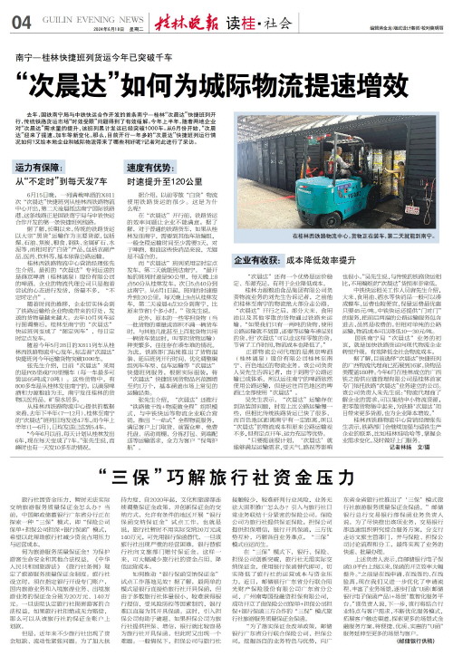 南宁—桂林快捷班列货运今年已突破千车 “次晨达”如何为城际物流提速增效   去年,国铁南宁局与中铁快运合作开发的首条南宁—桂林“次晨达”快捷班列开行,传统铁路货运市场“时效受限”问题得到了有效缓解。今年上半年,随着两地企业对“次晨达”需求量的提升,该班列累计发运已经突破1000车。从6月份开始,“次晨达”迎来了提速、加车等新变化。那么,目前开行一年多的“次晨达”快捷班列运行情况如何?又给本地企业和城际物流带来了哪些利好呢?记者对此进行了采访。