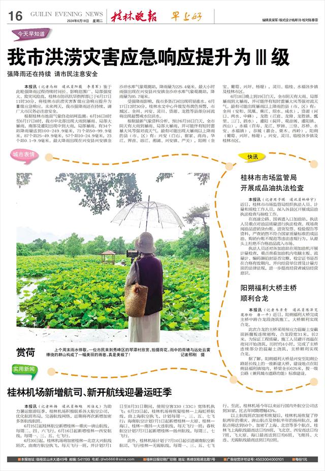 我市洪涝灾害应急响应提升为Ⅲ级 强降雨还在持续 请市民注意安全   本报讯(记者马翔 通讯员阳薇 李勇军)鉴于此轮强降雨过程持续时间长、影响范围广、局部强度大、致灾风险高,桂林市防汛抗旱指挥部已于6月17日11时30分,将桂林市洪涝灾害Ⅳ级应急响应提升为Ⅲ级应急响应。未来两天,我市强降雨还在持续,请广大市民务必注意安全。