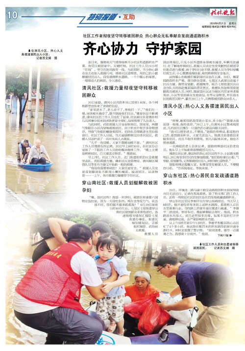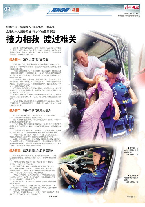 危难时众人挺身而出 守护30公里回家路 接力相救 渡过难关   连日来,在防汛救灾前线,坚守一线的工作人员在洪水中织就了一张守护人民生命财产的安全网,完成一次次救援。昨天,记者就目睹了这样一场救援:洪水中,一名孩子癫痫发作,正当母亲手足无措时,救援人员出现了……