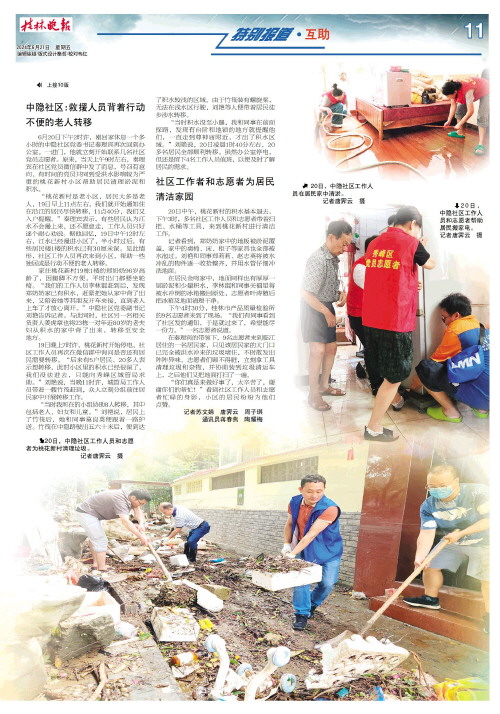 20日上午,消防人员再次驾驶皮划艇进入小区,将居民贺柏珠救出。贺柏珠78岁,下半身瘫痪,行动不便。救援时,消防人员小心翼翼,将老人抬上皮划艇,并送至安全地带。