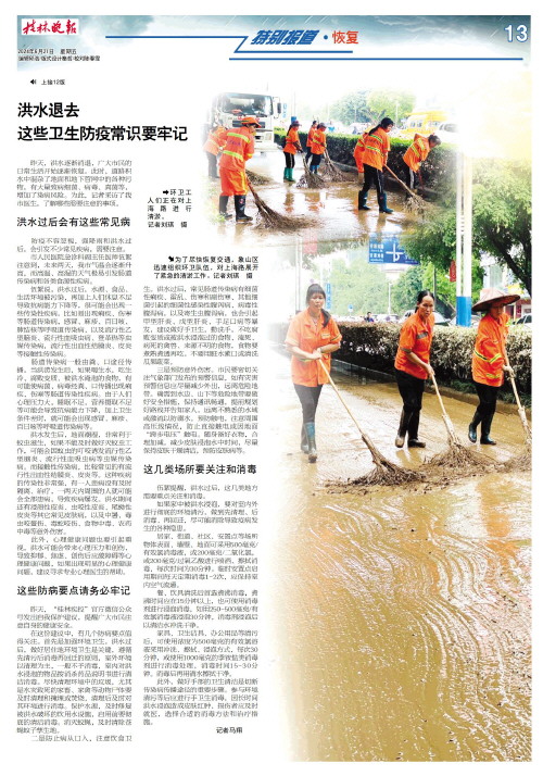 这些卫生防疫常识要牢记   昨天,洪水逐渐消退,广大市民的日常生活开始逐渐恢复。此时,道路积水中混杂了地面和地下管网中的各种污物,有大量致病细菌、病毒、真菌等,增加了染病风险。为此,记者采访了我市医生,了解哪些需要注意的事项。